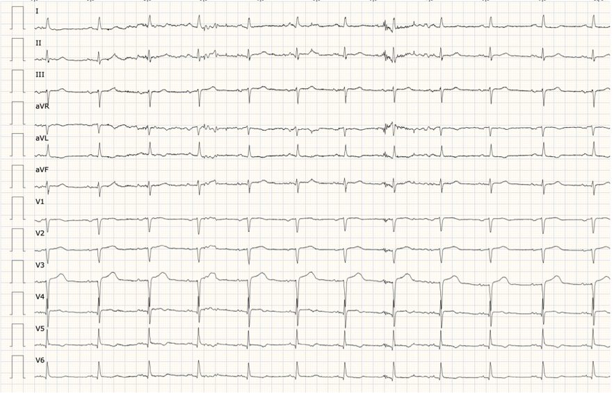 A su llegada a urgencias se realiza ECG y seriación de troponinas que muestra elevación con curva (535 ng/L y 144 ng/L). Las constantes, exploración física y analítica básica (hemograma y bioquímica) no mostraron hallazgos significativos.