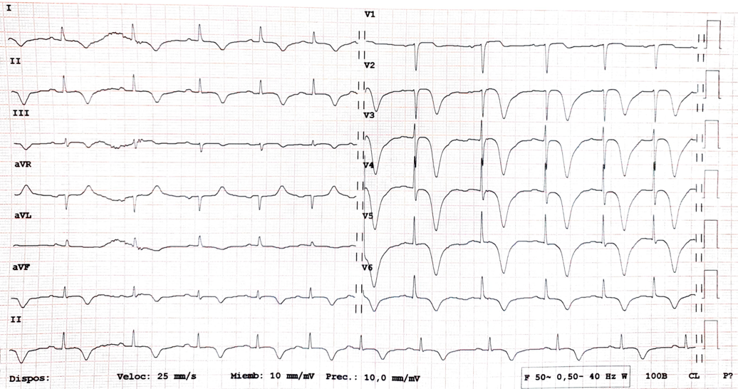 A las 24 horas del ingreso el ECG mostró ondas T negativas profundas generalidas y QT largo.