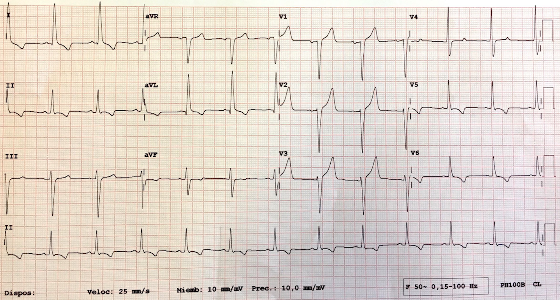 Varón de 54 años sin cardiopatía previa conocida derivado a urgencias por dolor torácico. Entre sus antecedentes médicos destaca hipertensión arterial conocida desde hace 3 años en tratamiento con ramipril 5 mg, tabaquismo y obesidad grado I. Su mujer comenta olvidos frecuentes de su medicación crónica y no suele realizarse controles de tensión arterial. Según relatan sus familiares se encontraba trabajando como hace habitualmente en una pequeña huerta de su propiedad cuando tras levantar un peso importante ha comenzado con un dolor centrotorácico que describía como una presión que irradiaba a brazo izquierdo, cuello y espalda. Dado que el dolor persistió durante más 30 minutos decidieron avisar al 112. Cuando los servicios de emergencias llegaron al domicilio, el paciente presentaba regular estado general con importante agitación y ansiedad que se acompañaba de sudoración profusa y palidez cutánea. Tensión arterial: 200/110 mmhg, frecuencia cardíaca: 90 lpm, frecuencia respiratoria: 22 rpm, saturación de O2: 94%, afebril. Auscultación cardíaca: taquicardíco con ruidos rítmicos, describen soplo sistólico eyectivo en foco aórtico con segundo ruido conservado junto con soplo protodiastólico decreciente en borde esternal izquierdo medio. Auscultación pulmonar con roncus pulmonares dispersos. Extremidades inferiores sin edemas y pulsos periféricos conservados.