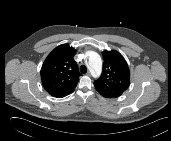 3. En nuestro caso tanto el electrocardiograma que no presenta datos de isquemia miocárdica aguda (descenso del segmento ST menor a 1 mm con onda T negativa asimétrica en I-II-aVL, V5-V6 sugestivo de sobrecarga sistólica de ventrículo izquierdo) como los hallazgos de ensanchamiento del mediastino superior en la radiografía de tórax aumentan la probilidad de que se trate de un síndrome aórtico agudo (SAA). Dada la elevada morbimortalidad que presenta esta entidad es indispensable confirmar o excluir su diagnóstico, siendo para ello fundamental las técnicas de imagen, como son la ecocardiografía (particularmente el ecocardiograma transesofágico) y la tomografía computerizada (TC). En casos de baja probabilidad clínica podría considerarse la determinación del dímero D debido a su elevado valor predictivo negativo para descartar esta entidad. La ecocardiografía es de gran utilidad en pacientes inestables o en casos de alergia al contraste iodado (utilizado en el TC). Por otro lado, el angio-TC (con una sensibilidad y especificidad > del 93 y 83%, respectivamente) es la técnica de imagen más utilizada para el diagnóstico del SAA, en especial en la disección de aorta. Dado que nuestro paciente inicialmente no presentaba deterioro hemodinámico solicitamos un angio-TC (ver imagen) que mostró un aneurisma de aorta ascendente con flap intimal que se origina en aorta ascendente a la salida del tronco braquiocefálico derecho hasta la aorta descendente inmediatamente distal a la salida de la arteria subclavia izquierda, compatible con Disección tipo A de Stanford. Es importante recordar que los SAA puede presentarse de formas muy diversas (infarto agudo de miocardio, insuficiencia aórtica aguda, taponamiento cardíaco, síncope, ictus isquémico o AIT, alteraciones perfusión periférica y crisis hipertensiva).